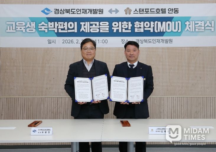 미담타임스 김준완 기자 | 경상북도인재개발원은 2.2. 인재개발원에서 ‘스텐포드호텔 안동’과 교육생 숙박 편의 제공 및 지역 관광 활성화를 위한 업무협약(MOU)을 체결했다.