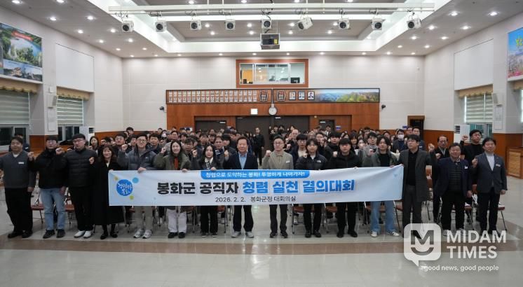 미담타임스 김준완 기자 | 봉화군은 2일 군청 대회의실에서 직원 300여 명이 참석한 가운데 ‘2026년 봉화군 공무원 청렴 실천 결의대회’를 개최하여 청렴 실천에 대한 의지를 다시 한번 다졌다.