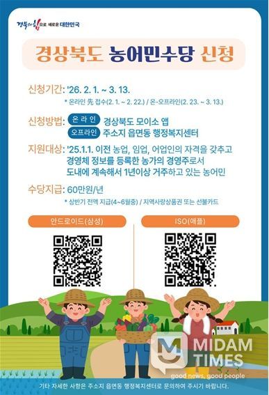 미담타임스 김준완 기자 | 경상북도는 농어업과 농어촌의 공익적 가치를 유지·증진하는 농어민지원을 위해 추진하고 있는 ‘2026년 경상북도 농어민 수당’신청을 오는 2월 1일부터 접수한다.