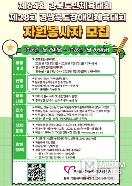 미담타임스 김준완 기자 | 안동시는 안동시자원봉사센터와 함께 안동과 예천에서 공동 개최되는 ‘제64회 경북도민체육대회’ 및 ‘제28회 경상북도장애인체육대회’의 성공적인 개최를 위해 자원봉사자 600명을 모집한다고 밝혔다.