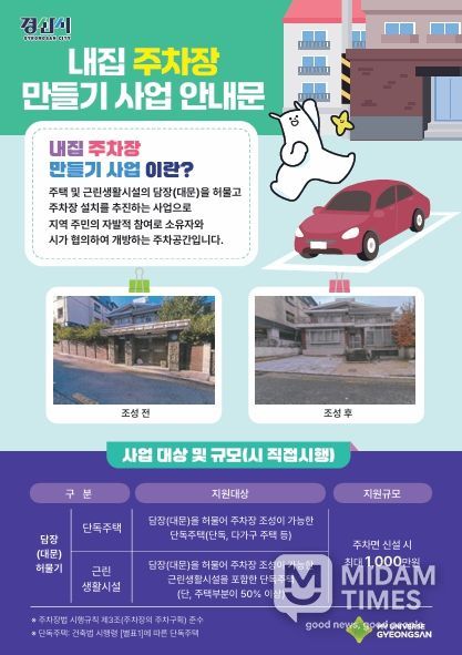 미담타임스 김준완 기자 | 경산시는 주택 밀집 지역의 주차난을 해소하고 쾌적한 주거환경을 조성하기 위해 '2026년 내 집 주차장 만들기 시범 사업'을 추진하고 27일까지 신청을 받는다.