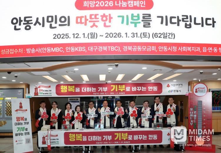 미담타임스 김준완 기자 | 안동시가 ‘행복을 더하는 기부, 기부로 바꾸는 안동’이라는 슬로건으로 2025년 12월 1일부터 2026년 1월 31일까지 총 62일간 실시한 ‘희망2026 나눔캠페인’에서 9억 4천만 원을 모금하며 사랑의 온도 134℃를 기록했다.