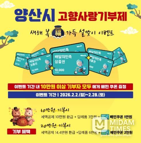 미담타임스 김교환 기자 | 양산시는 설 명절을 맞아 고향사랑기부제 참여를 활성화하기 위해 '새해 복(福) 가득 설맞이 이벤트'를 2월 2일부터 2월 28일까지 실시한다고 밝혔다.
