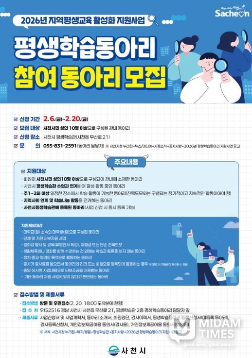 미담타임스 김교환 기자 | 사천시는 평생학습도시로서 지역 특성을 반영한 평생학습 추진체계를 정비하고 중장기적 관점에서 지속 가능한 평생학습 기반 구축을 위해 '2026년 평생학습동아리 활성화 지원사업'을 추진한다.