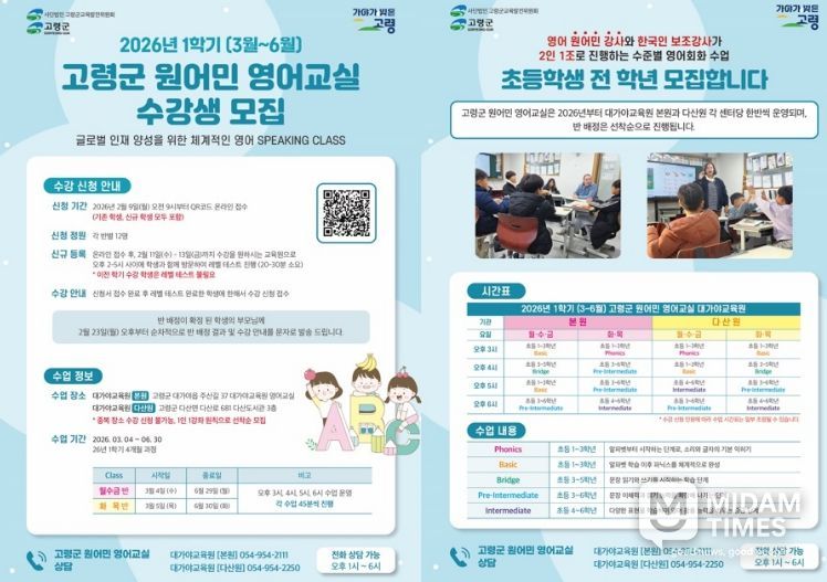 미담타임스 김준완 기자 | 사)고령군교육발전위원회(이사장 성현덕)는 고령군 초등학생을 대상으로 영어 의사소통 능력 향상과 국제적 감각 함양을 위해 ‘2026년 고령군 원어민 영어교실’ 1학기 과정을 운영한다.