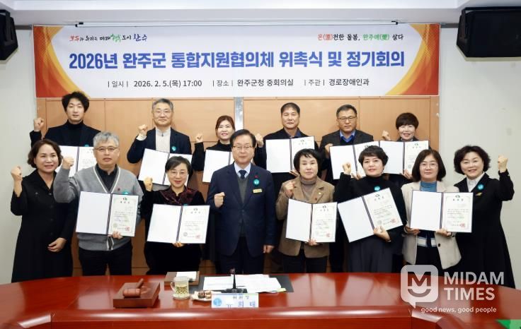 지난 5일 완주군은 군청 중회의실에서 ‘완주군 통합지원협의체’ 위촉식을 열고, 제1차 정기회의를 열어 ‘2026년 통합돌봄사업 실행계획(안)’을 심의·의결했다.