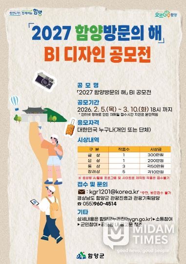 공모 주제는 '2027 함양 방문의 해'를 상징하는 브랜드 이미지(BI) 디자인이며, 대한민국 국민이라면 누구나 개인 또는 단체 자격으로 참여할 수 있다. 접수 기간은 2월 5일부터 3월 10일까지다.