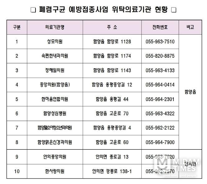 미담타임스 김교환 기자 | 함양군은 65세 이상 어르신(올해 기준 1961년 12월 31일 이전 출생자)을 대상으로 폐렴구균 무료 예방접종을 연중 실시하고 있다고 밝혔다.
