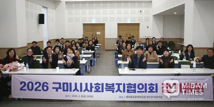 미담타임스 김준완 기자 | 구미시는 구미시사회복지협의회 주관으로 지난 6일 새마을운동테마공원 연수관 대강의실에서 임원과 회원 등 40여 명이 참석한 가운데 '2026년 구미시사회복지협의회 정기총회'를 열었다.