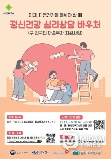 미담타임스 김준완 기자 | 경산시는 우울, 불안 등 정서적 어려움이 있는 시민에게 대화 기반의 전문심리상담 서비스를 제공하는 '정신건강 심리상담 바우처사업'을 시행한다.