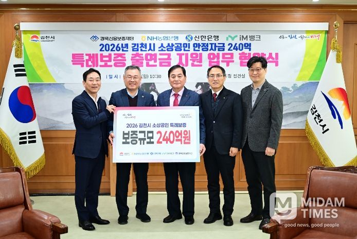 미담타임스 김준완 기자 | 김천시는 관내 소상공인 경영 안정자금 지원을 위해 경북신용보증재단, NH농협은행, 신한은행, iM뱅크와 협약을 맺고 총 240억 원 규모의 소상공인 특례 보증 지원에 나선다고 9일 밝혔다.