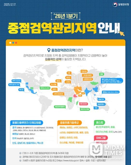 질병관리청은 해외감염병 발생 동향과 위험성 평가를 반영하여 총 24개국가(지역)를 중점검역관리지역으로 지정하여 운영하고 있으며, 해당 지역을 방문하거나 체류 후 입국하는 경우에는 Q-CODE(또는 건강상태질문서) 제출을 통해 검역관에게 건강상태를 신고하도록 하고 있다.