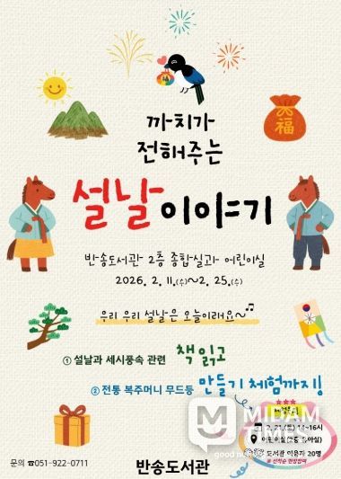 미담타임스 김교환 기자 | 부산광역시립반송도서관(관장 박미양)은 우리나라 대표 전통 명절 설날을 맞아 사학특성화 프로그램 ‘까치가 전해주는 설날 이야기’를 오는 11일부터 25일까지 운영한다.