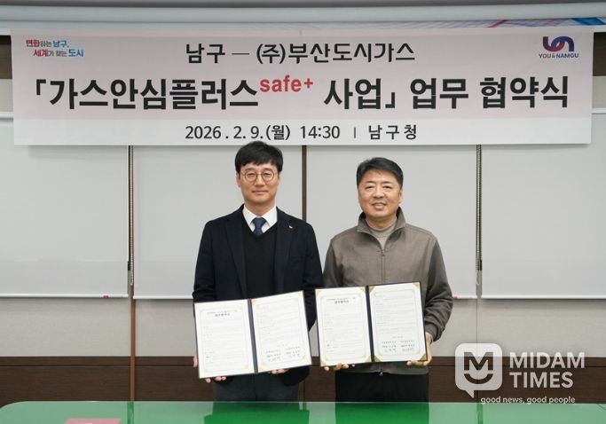 미담타임스 김교환 기자 | 부산 남구는 ㈜부산도시가스와 함께 지난 2월 9일, 가스 사고 예방과 안전 사각지대 해소를 위해 안전 취약계층을 대상으로 한 '가스안심플러스 세이프플러스(safe+) 사업' 업무협약(MOU)을 체결했다고 밝혔다.