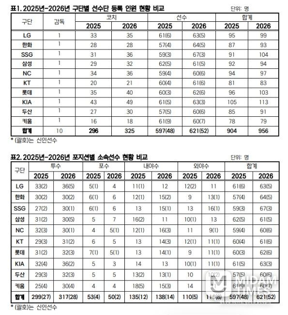 미담타임스 박민정 기자 | KBO는 2월 10일(화) 2026년 KBO 리그 소속 선수 명단을 공시했다. 10개 구단은 총 621명의 선수를 등록해, 597명이 등록했던 2025년보다 24명이 늘어났다.
