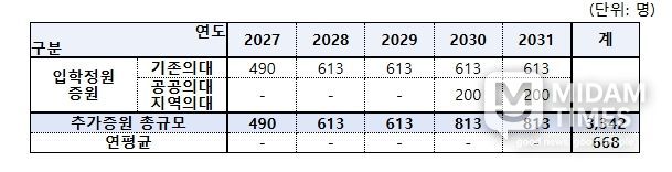 이와 함께 2027년의 경우 기존의대는 증원규모의 80% 규모(490명)를 증원하도록 해서 증원 초기 의대교육 현장의 부담을 완화할 수 있도록 했다.