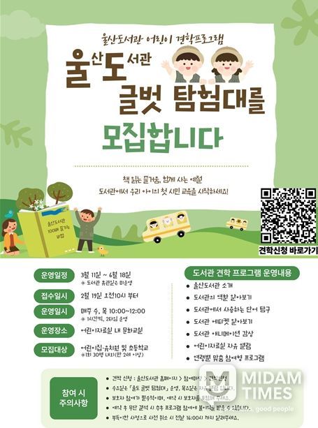 울산도서관 관계자는 “어린이들이 도서관을 단순히 책을 빌리는 곳이 아닌 즐거운 탐험의 공간으로 인식할 수 있도록 다채로운 프로그램을 진행할 예정”이라며 “지역 내 유치원·어린이집 및 초등학교의 많은 관심과 참여를 바란다”라고 말했다.