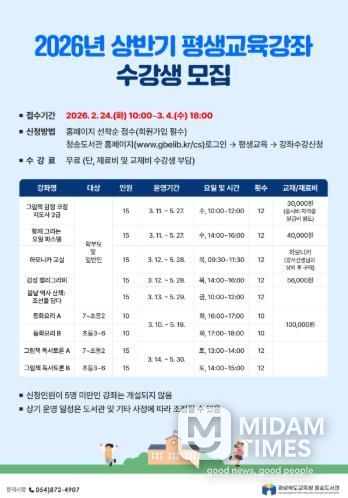 미담타임스 김준완 기자 | 경상북도교육청 청송도서관은 일상 속에서 배움의 즐거움을 발견하고, 배움으로 삶의 활력을 찾도록 ‘상반기 평생교육강좌'를 마련했다.