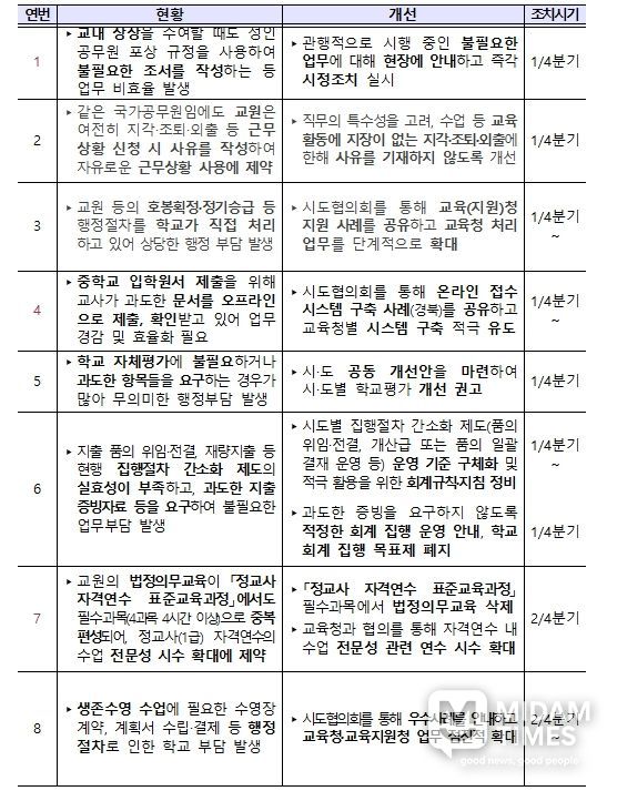 이에 앞서 지난 12월에 실시한 현장 교원, 전문가 등과의 사전 간담회를 통해 제안된 과제는 현장의 부담을 조금이나마 덜어주기 위해 우선 개선한다.