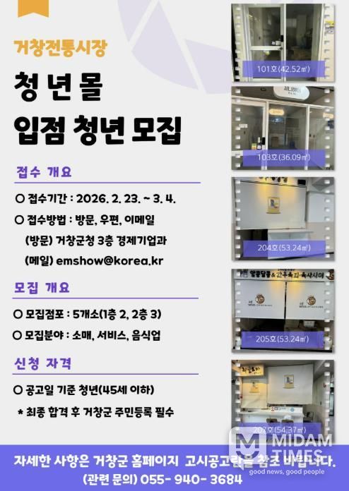 미담타임스 김교환 기자 | 거창군은 전통시장 활성화와 청년 창업 기반 조성을 위해 거창전통시장 내 청년몰 ‘거창in140’에 입점할 청년 창업인(상인)을 공개 모집한다.
