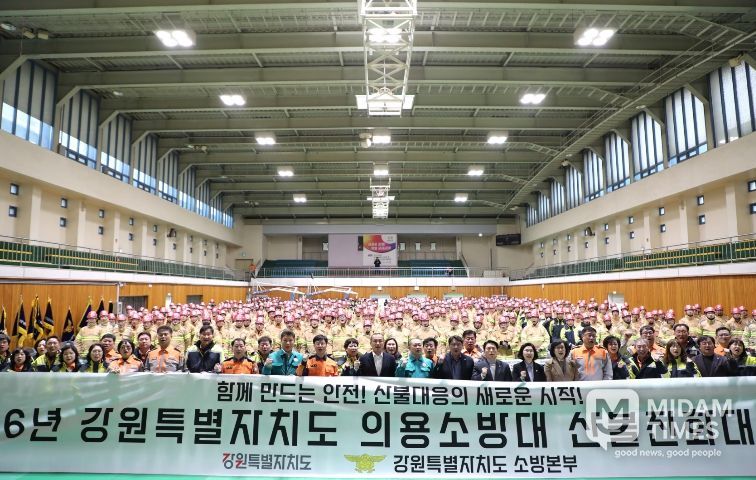 미담타임스 정인화 기자 | 강원특별자치도는 2월 24일 원주에서 김진태 도지사와 김시성 도의회 의장을 비롯한 도의원, 관계기관장, 의용소방대원 등 800여 명이 참석한 가운데 전국에서 두 번째 사례로 '강원특별자치도 의용소방대 산불진화대 발대식'을 개최했다고 밝혔다.
