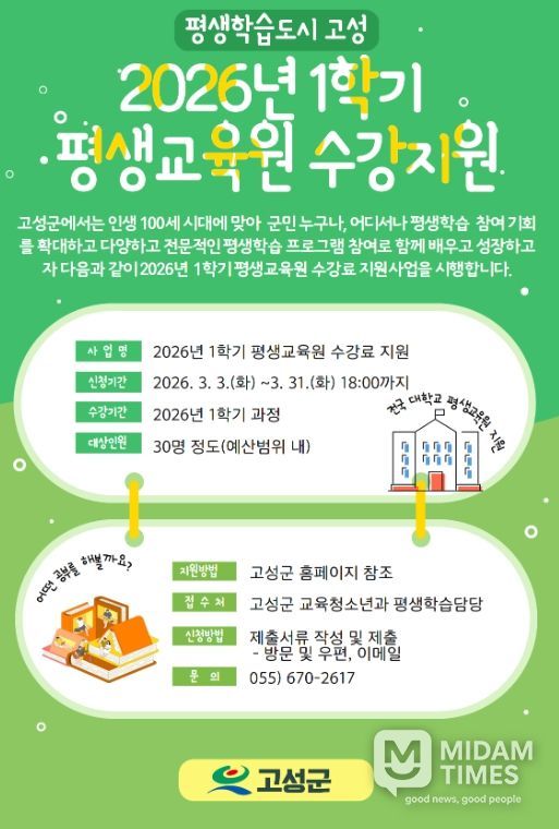 미담타임스 황명수 기자 | 고성군은 군민들에게 폭넓은 평생학습의 기회를 제공하고, 다양하고 전문적인 평생학습 프로그램 참여로 함께 배우고 성장하고자 ‘2026년 1학기 평생교육원 수강료 지원사업’을 시행한다.
