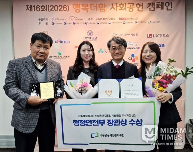 미담타임스 전해찬 기자 | 대구공공시설관리공단이 지난 2월 26일 (사)한국언론인협회와 (사)한국경영자총협회가 공동 주최하는 ‘2026 행복더함 사회공헌 캠페인’에서 우수기업으로 선정되어 행정안전부 장관상을 수상했다.