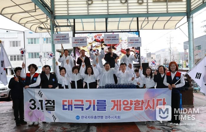 미담타임스 김준완 기자 | 한국자유총연맹 경주시지회는 제107주년 3.1절을 맞아 순국선열의 희생정신을 기리고 시민들의 자발적인 태극기 게양 참여를 독려하기 위한 ‘3.1절 기념 태극기 나눔캠페인’을 개최했다.