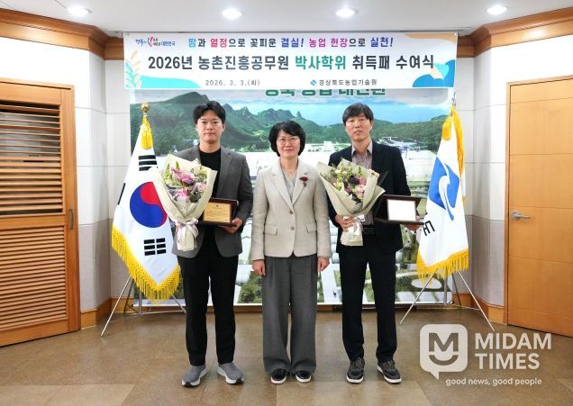미담타임스 김준완 기자 | 경북농업기술원은 3일 전문 연구 역량 강화를 위해 박사학위를 취득한 농촌진흥공무원 2명에게 박사학위 취득패를 수여하고 격려했다.