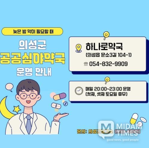미담타임스 김준완 기자 | 의성군은 군민들이 늦은 밤에도 안전하게 의약품을 구입하고 전문적인 복약 상담을 받을 수 있도록 지난해에 이어 2026년에도 공공심야약국을 지속 운영한다고 밝혔다.