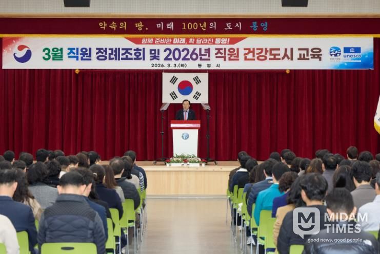 미담타임스 황명수 기자 | 통영시는 지난 3일 시청 강당에서 열린 ‘2026년 3월 직원 정례조회’를 통해 2026년을 “함께 준비한 미래, 확 달라진 통영”을 시정 방향으로 민선8기 핵심 사업을 차질 없이 마무리하는 동시에 통영의 미래 성장 기반을 마련할 장기 사업과 시민이 일상에서 체감할 단기 사업을 함께 추진해 나간다고 밝혔다.