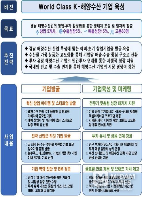 해당 사업은 (재)경남테크노파크가 주관하고 (재)경남항노화연구원이 참여기관으로 함께 수행한다. 올해 사업비 15억 원(국비 7.5억 원, 도비 7.5억 원)을 투입해 유망 해양수산 기업의 창업부터 투자유치, 글로벌 시장 진출까지 전 과정을 지원한다.