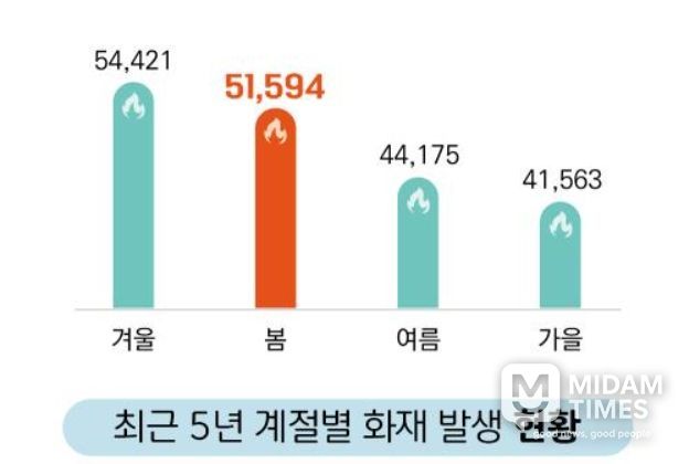 소방청의 최근 5년간(2021~2025년) 통계 분석에 따르면, 봄철(3~5월)에 발생한 화재는 총 5만 1,594건으로 전체 화재의 26.9%를 차지했다. 이는 겨울철에 이어 두 번째로 높은 수치다.