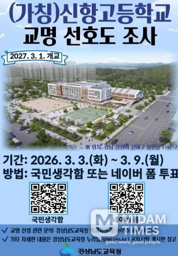 미담타임스 박민정 기자 | 경상남도교육청은 2027년 3월 문을 여는 신설 학교 3곳의 이름을 정하기 위해 오는 3일부터 9일까지 도민 선호도 조사를 진행한다.
