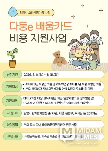 미담타임스 황명수 기자 | 경남 밀양시는 다자녀 가정의 교육비 부담을 경감하고 아이 키우기 좋은 환경을 조성하기 위해 ‘다둥e 배움카드 지원 사업’을 본격 시행한다.