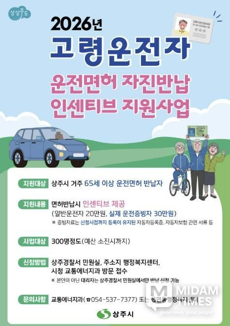 미담타임스 김준완 기자 | 상주시는 고령운전자의 교통사고 예방과 안전한 교통환경 조성을 위해 고령자 운전면허 자진반납에 따른 인센티브 금액을 2026년부터 최대 30만원까지 확대 시행한다고 밝혔다.