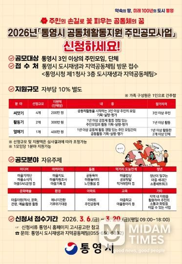 미담타임스 황명수 기자 | 통영시는 주민 스스로 계획하고 공동체적 방식으로 추진하는 활동을 지원하기 위해 2026년'통영시 공동체활동지원 주민공모사업'에 참여할 공동체를 오는 6일부터 20일까지 모집 접수한다.