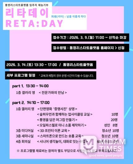 미담타임스 황명수 기자 | 통영시는 오는 14일진행되는 통영리스타트플랫폼 입주자 재능기부 프로그램 ‘리타(利他)데이’ 참여자를 모집한다고 전했다.