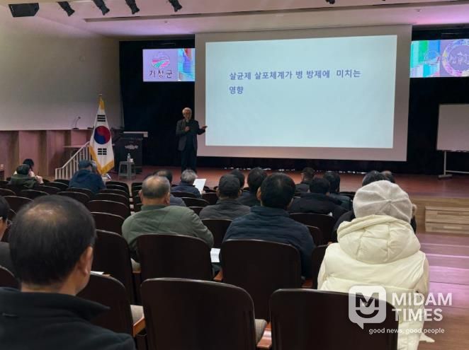 군은 지난 4일 미래농업복합교육관 대교육장에서 사과 재배농가 70여 명이 참석한 가운데 사과 병해충 맞춤형 컨설팅 참여농가 교육을 개최하고 올해 사과 병해 관리 방향과 방제 기준을 설명했다.