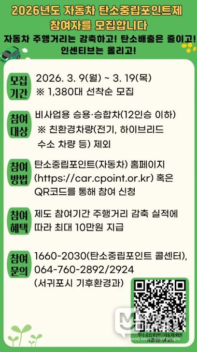 미담타임스 김준완 기자 | 서귀포시는 3월 9일부터 3월 19일까지 수송부문 온실가스 감축 프로그램인 자동차 탄소중립포인트제 참여자 1,380명을 선착순 모집한다고 밝혔다.