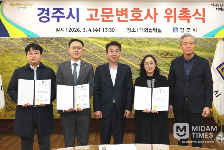 미담타임스 김준완 기자 | 경주시는 지난 4일 시청 대외협력실에서 시정 전반의 법률 자문과 소송 대응을 지원할 고문변호사 3명을 위촉했다.