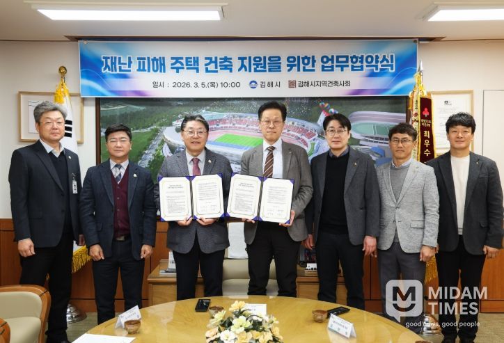미담타임스 황명수 기자 | 김해시는 5일 오전 10시 김해시청 시장실에서 김해지역건축사회와 재난으로 피해를 입은 주민들의 주거 안정을 지원하기 위한 ‘재난 피해 주택 건축 지원 업무협약’을 체결했다.