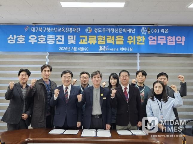 미담타임스 전해찬 기자 | 대구북구청소년교육진흥재단과 (재)청도우리정신 문화재단은 2026년 3월 4일 13시 지역 청소년 교류협력 활성화를 위한 상호업무협약(MOU)을 체결했다고 밝혔다.