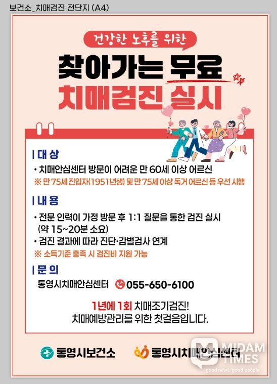 미담타임스 황명수 기자 | 통영시는 올해 3월부터 9월까지 7개월간 치매로 진단받지 않은 만 60세 이상 지역주민 중 치매안심센터 방문이 어려운 주민을 대상으로‘찾아가는 치매조기검진’을 실시한다고 5일 밝혔다.