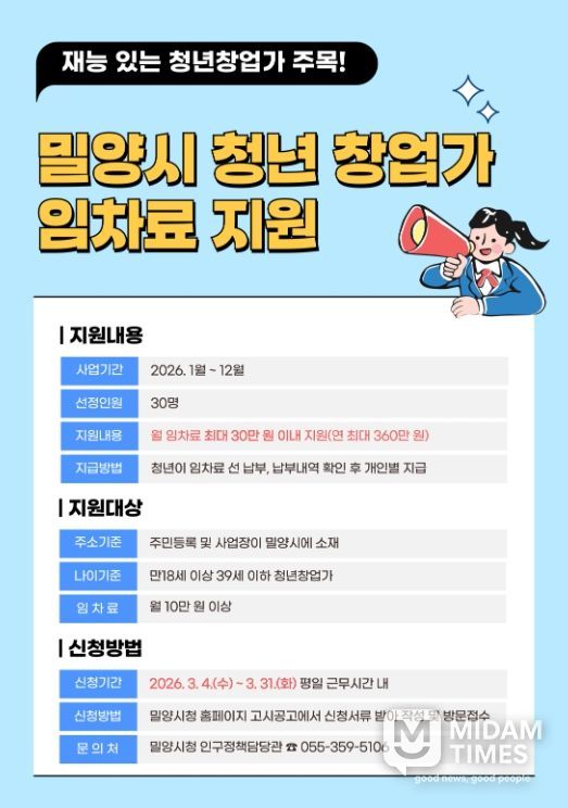 미담타임스 황명수 기자 | 경남 밀양시는 고물가와 경기 침체로 어려움을 겪는 청년 창업가들의 초기 경영 부담을 덜어주고 지역 내 안정적인 정착을 돕기 위해 ‘2026년 청년창업가 임차료 지원사업’ 대상자를 모집한다.
