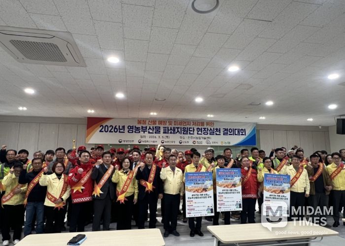 미담타임스 황명수 기자 | 진주시는 5일 진주시농업기술센터에서 봄철 산불조심기간(3.1.~3.7.)을 맞아 행정안전부, 농촌진흥청, 산림청, 경상남도, 농협 등 기관 관계자와 진주시 파쇄지원단 등 120여 명이 참여한 가운데 ‘2026년 영농부산물 파쇄지원단 현장 실천 결의대회 및 안전 처리 캠페인’을 개최했다.