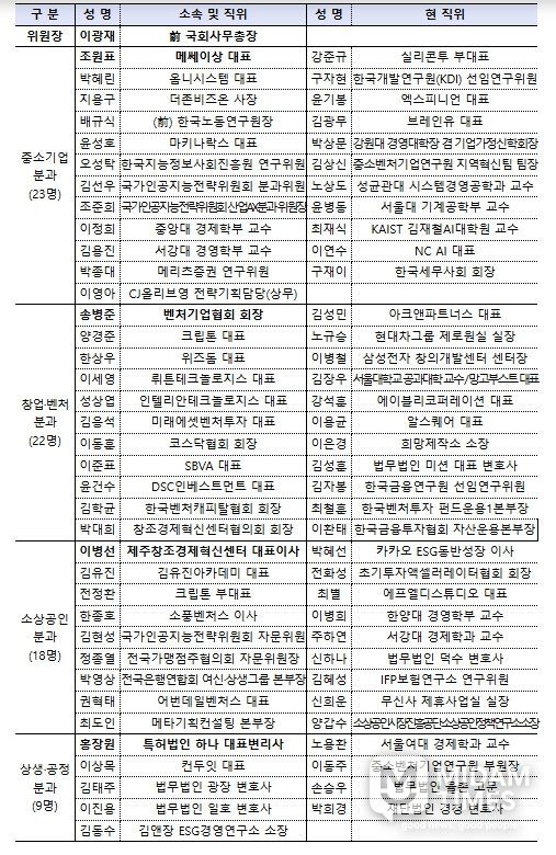 민관 정책협의회는 기업인, 민간 전문가, 학계, VC, 협·단체 등 총 72명의 위원으로 구성되어 출범일로부터 1년간 활동하게 된다. 또한 한성숙 중기부 장관과 이광재 전 국회사무총장이 공동위원장을 맡아 민관 정책협의회를 이끌어갈 예정이다.