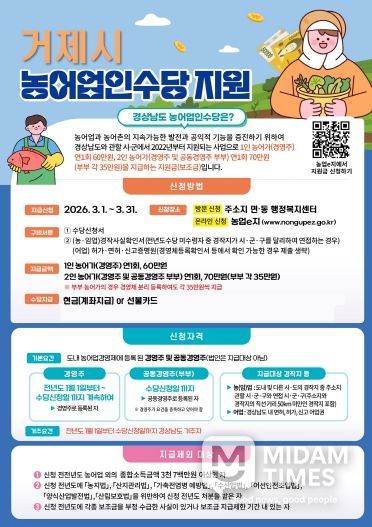 미담타임스 황명수 기자 | 거제시는 농어업·농어촌의 공익적 기능을 유지·증진하고 농어업인의 소득 안정을 지원하기 위해 ‘2026년 농어업인수당’ 신청을 3월 1일부터 3월 31일까지 접수하고 있다.
