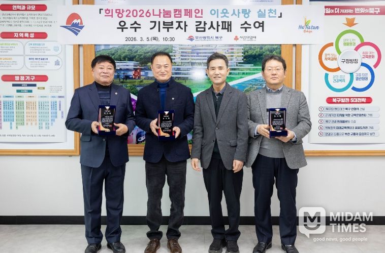 미담타임스 남혜영 기자 | 부산 북구는 희망2026나눔캠페인 기간 이웃사랑 실천에 앞장선 우수 기부자에게 부산사회복지공동모금회(회장 이수태) 감사패를 수여했다고 밝혔다.