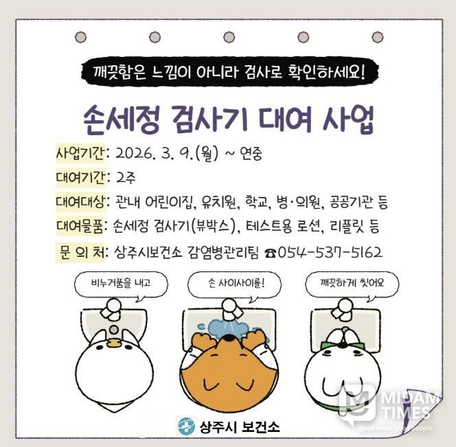 미담타임스 김준완 기자 | 상주시보건소는 지역 어린이집, 유치원, 학교, 공공기관 등을 대상으로 올바른 손씻기 습관 형성과 감염병 예방을 위한 ‘손세정 검사기 대여 서비스’를 3월부터 연중 운영한다고 밝혔다.